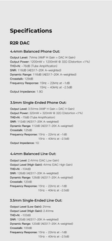 - Output Level (R2R mode): 7Vrms (4.4mm BAL), 3.5Vrms (3.5mm SE)